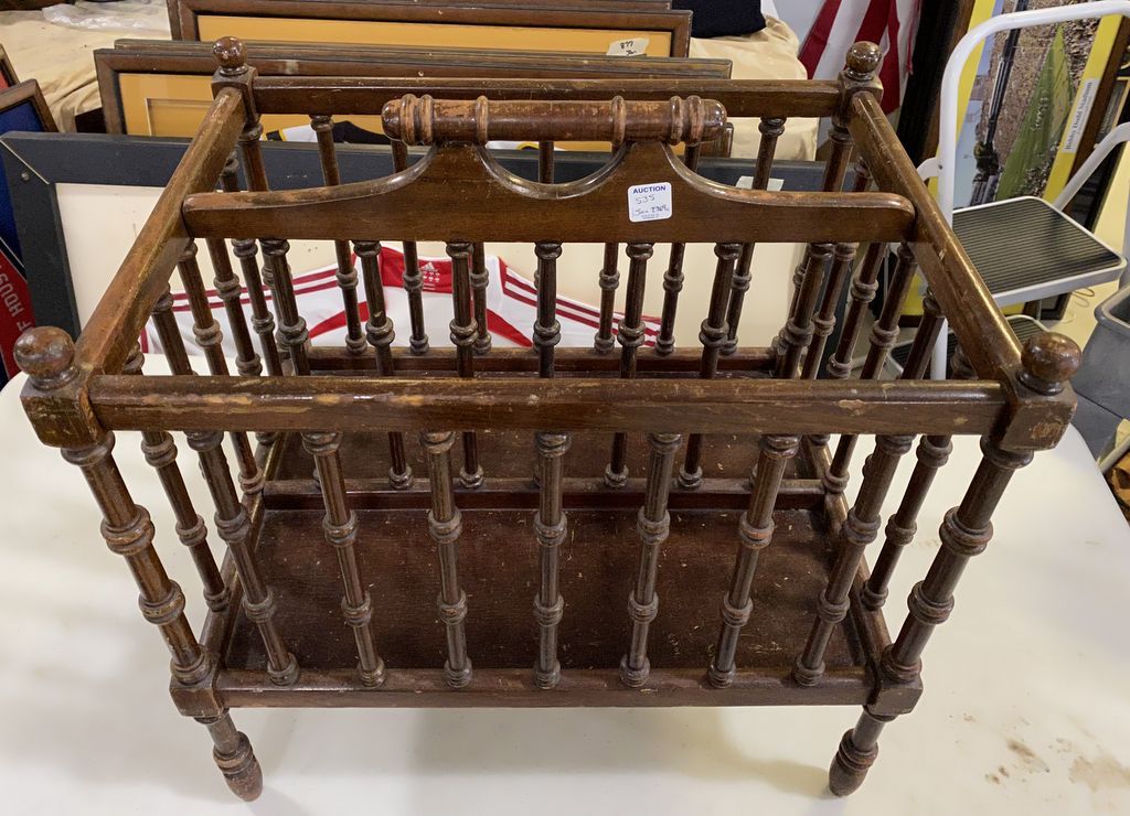 Vintage Mahogany Magazine Canterbury, has worn finish, with handle, 20"h., 19"w. Location Right Side 1st Row Vintage Mahogany Magazine Canterbury, has worn finish, with handle, 20"h., 19"w. Location Right Side 1st Row