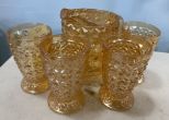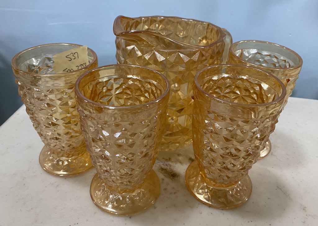 Small Carnival Glass Style Pitcher Set, pitcher 4 1/2"h. , and four glasses. Location Front Shelves Top Row Small Carnival Glass Style Pitcher Set, pitcher 4 1/2"h. , and four glasses. Location Front Shelves Top Row