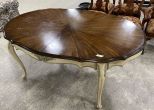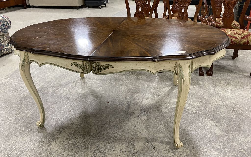 White Furniture Co. French Style Dining Table, painted white base, two leaves, and table pads, 28"h., 70"long Location Left Side 3rd Row White Furniture Co. French Style Dining Table, painted white base, two leaves, and table pads, 28"h., 70"long Location Left Side 3rd Row