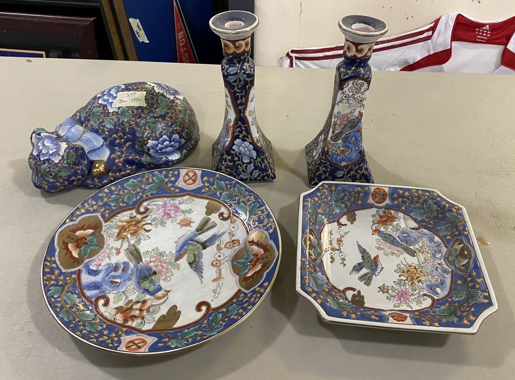 Group of Decorative Chinese Pottery, cat, candle holders, charger, plate. Location Front Shelves 2nd Shelf Group of Decorative Chinese Pottery, cat, candle holders, charger, plate. Location Front Shelves 2nd Shelf