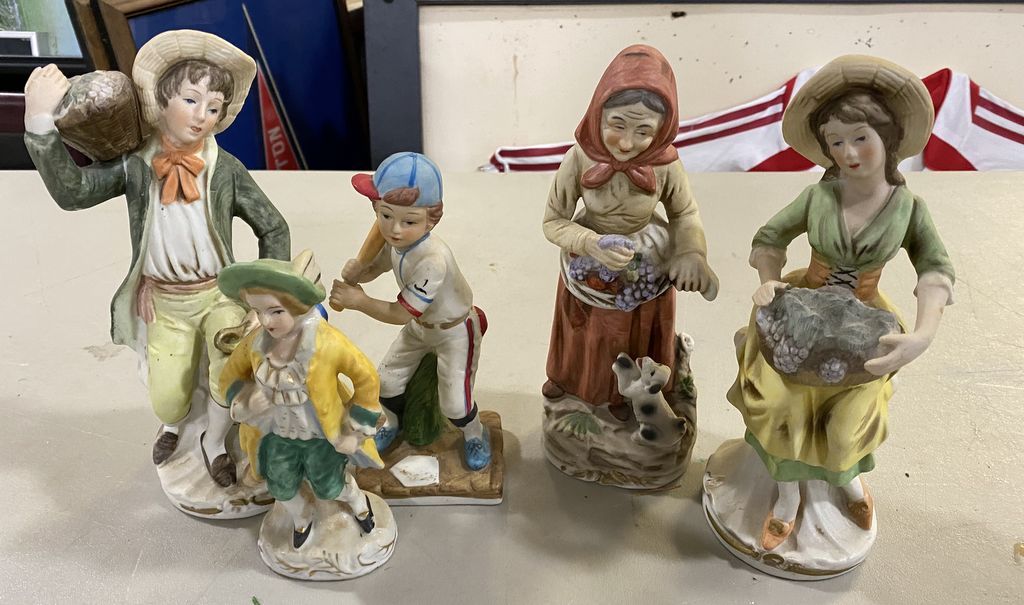 Four Bisque Porcelain Figurines, hand painted, 9"h. Location Front Shelves Top Row Four Bisque Porcelain Figurines, hand painted, 9"h. Location Front Shelves Top Row