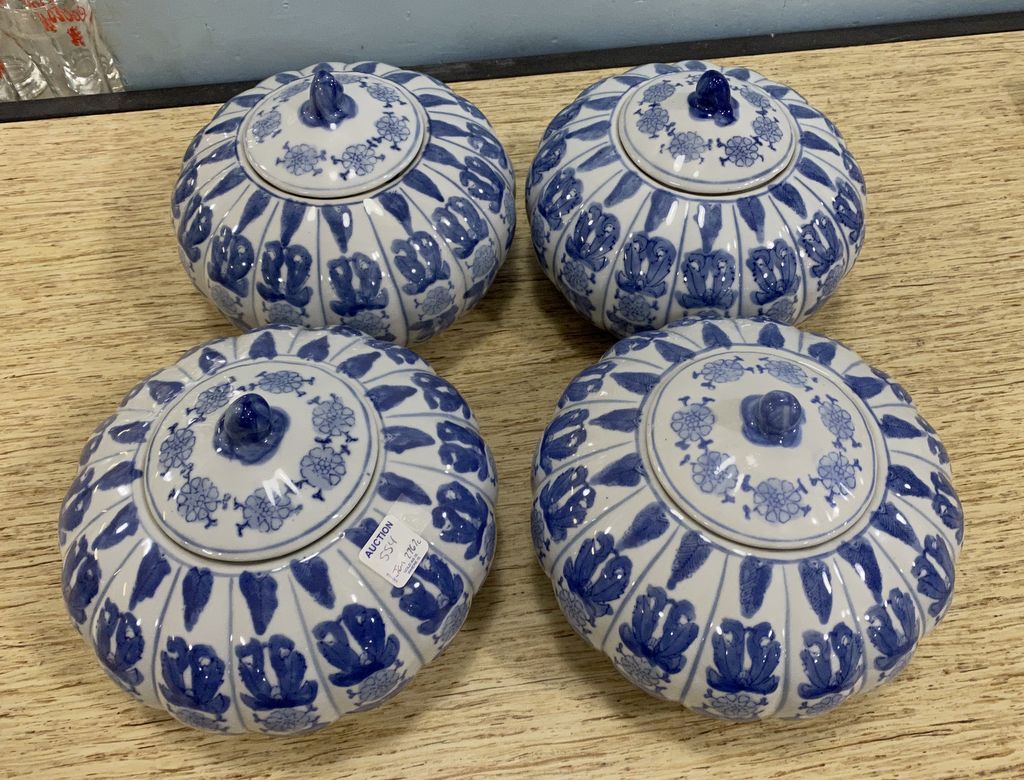 Four Blue and White Oriental Vases, with lids, 8"dia. Location Front Glass Display Case Four Blue and White Oriental Vases, with lids, 8"dia. Location Front Glass Display Case