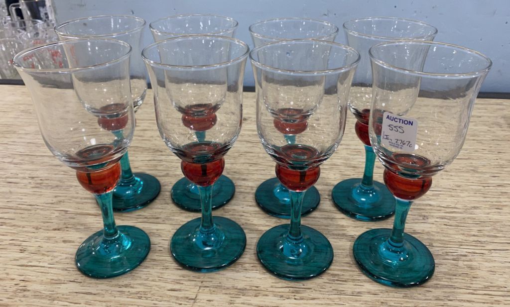 Eight Art Glass Wine Glasses, 7 1/2"h, Location Cases by Screen Eight Art Glass Wine Glasses, 7 1/2"h, Location Cases by Screen