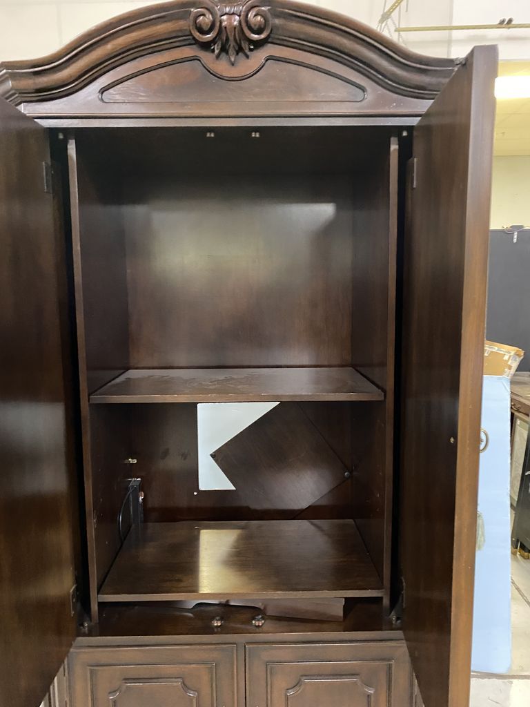 French Linen Press Style TV Armoire, one piece, four door, cherry, good condition, 90"h., 43"w., 22"d. Location Right Side 3rd Row French Linen Press Style TV Armoire, one piece, four door, cherry, good condition, 90"h., 43"w., 22"d. Location Right Side 3rd Row