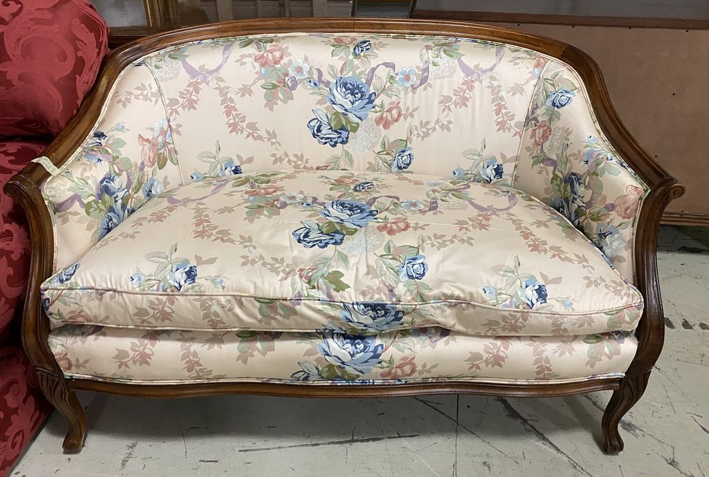 French Style Settee, floral pattern upholstery, single cushion, 50"h. Location Left Side 5th Row French Style Settee, floral pattern upholstery, single cushion, 50"h. Location Left Side 5th Row