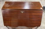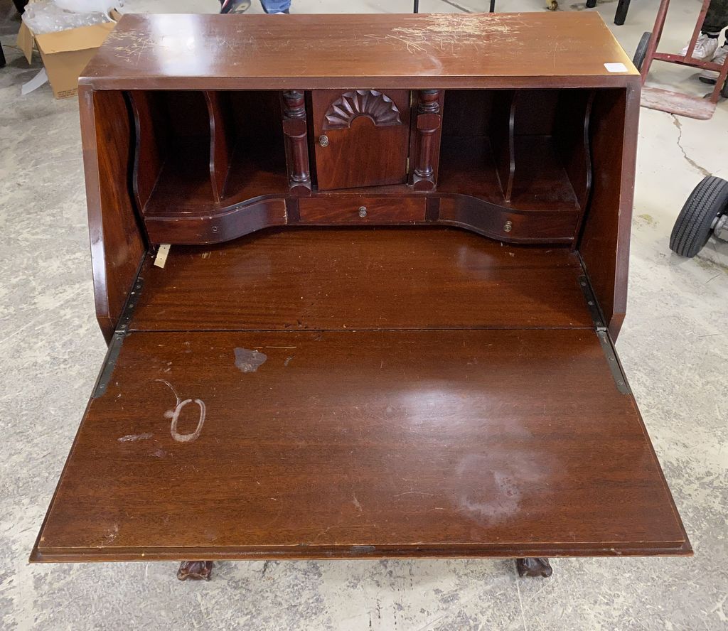 Mahogany Bowfront Secretary, drop front writing desk, three drawers, ball-n-claw footed, has scratches on top finish, 40"h., 29"w., 17"d. Location Right Side 1st Row Mahogany Bowfront Secretary, drop front writing desk, three drawers, ball-n-claw footed, has scratches on top finish, 40"h., 29"w., 17"d. Location Right Side 1st Row