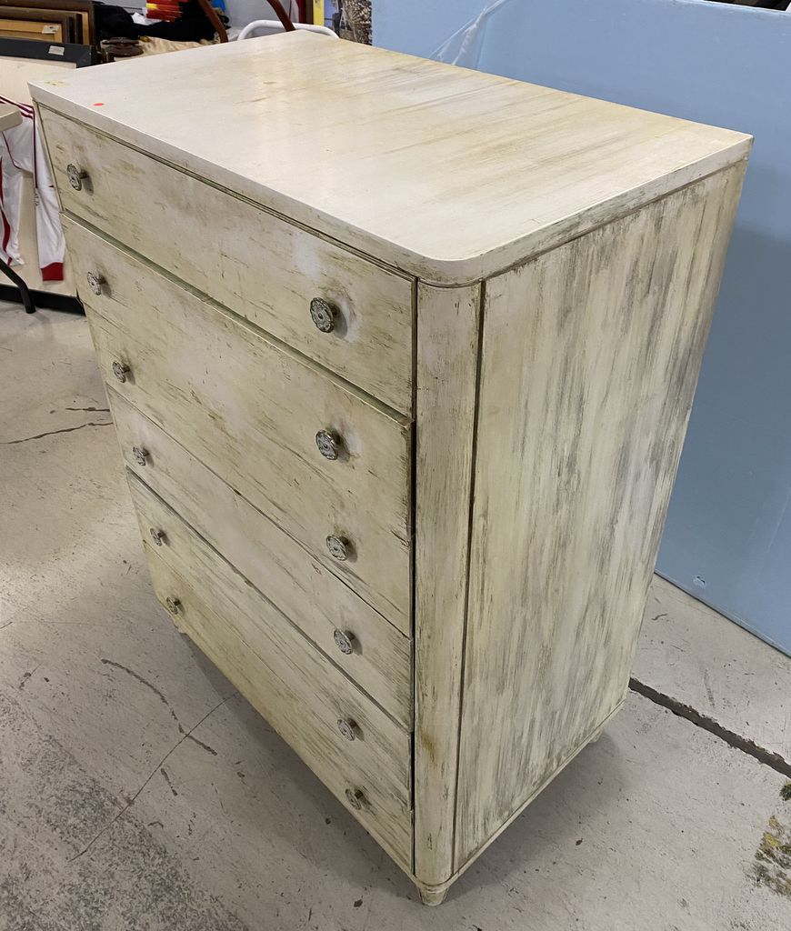 Painted White Distressed Chest of Drawers, 6 drawers, 46"h., 34"w., 20"d. Location Right Side 3rd Row Painted White Distressed Chest of Drawers, 6 drawers, 46"h., 34"w., 20"d. Location Right Side 3rd Row