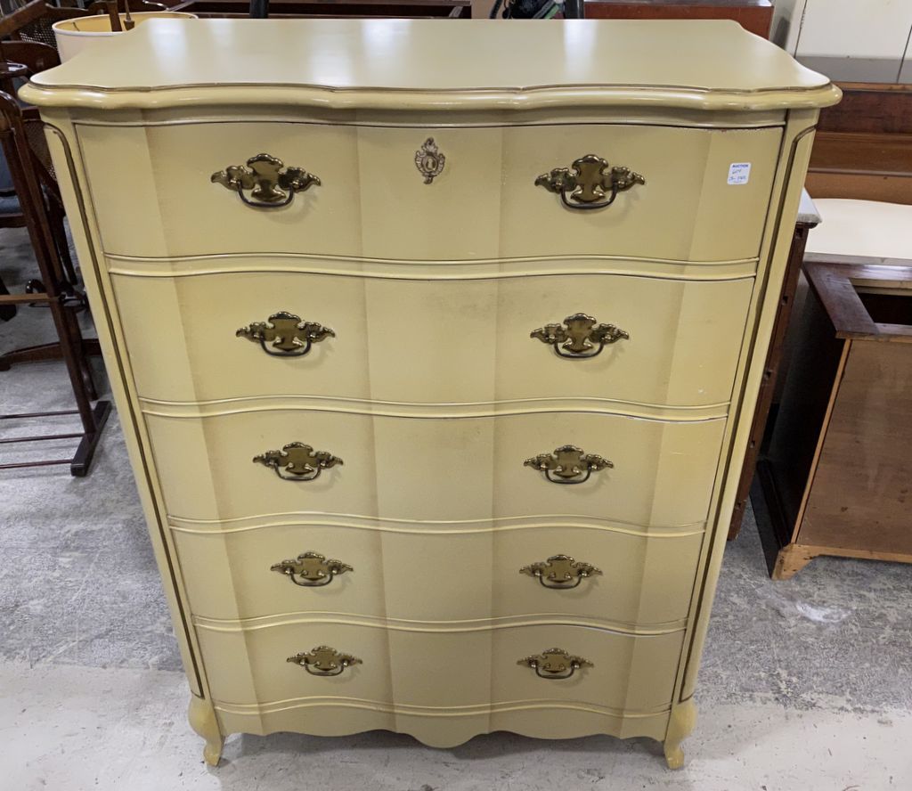 Mid Century French Style Chest of Drawers, five drawers, 50"h., 37"w., 19"d. Location Left Side 1st Row Mid Century French Style Chest of Drawers, five drawers, 50"h., 37"w., 19"d. Location Left Side 1st Row