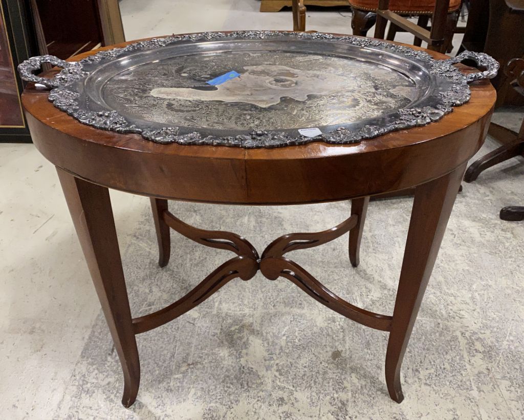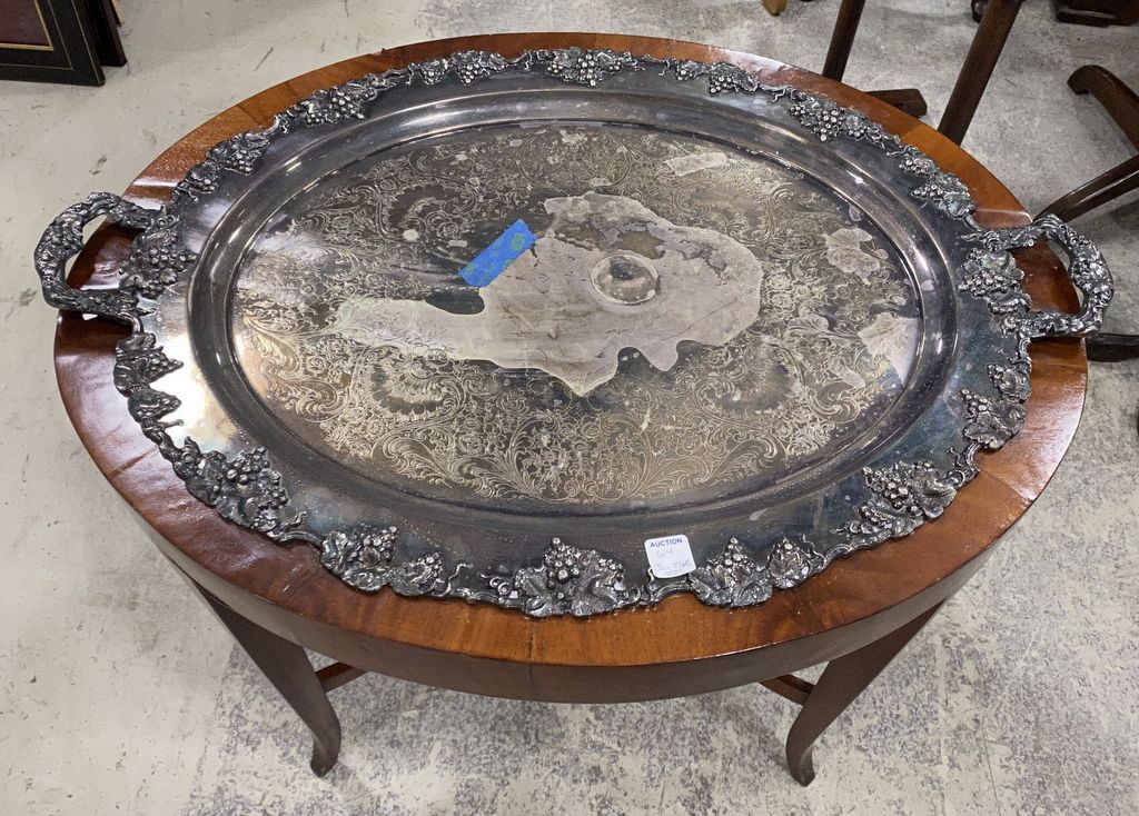 Round Oval Table with Silver Plate Tray, 22"h., 29"w. Round Oval Table with Silver Plate Tray, 22"h., 29"w.