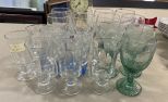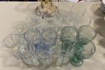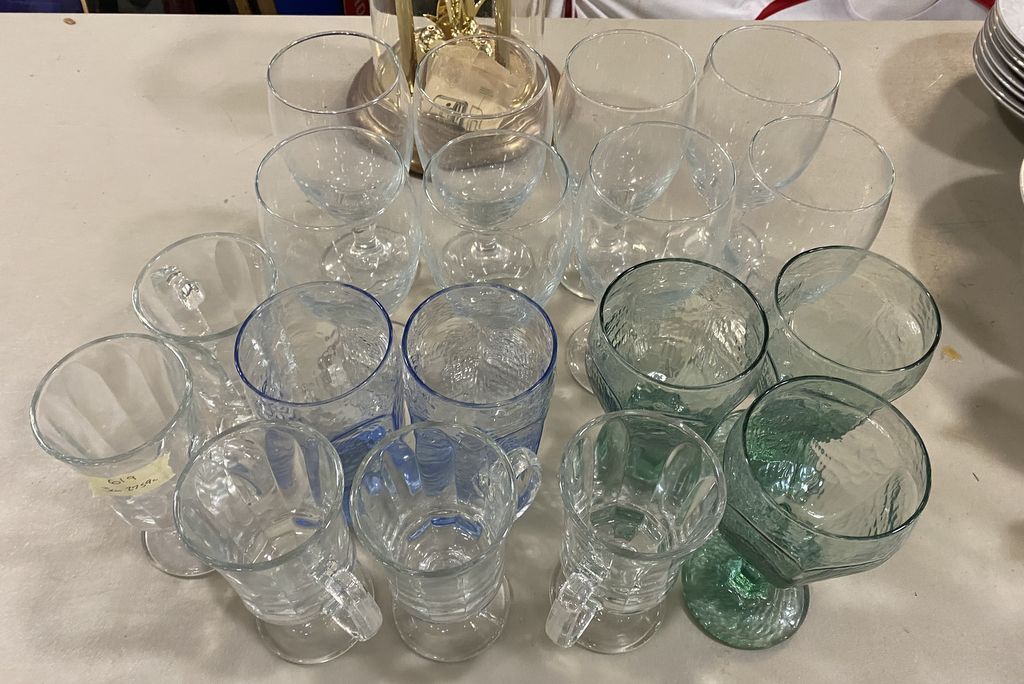 Group of drinking glasses, mixed sets, blue, clear, green glassware. Location Front Shelves 4th Shelf Group of drinking glasses, mixed sets, blue, clear, green glassware. Location Front Shelves 4th Shelf