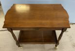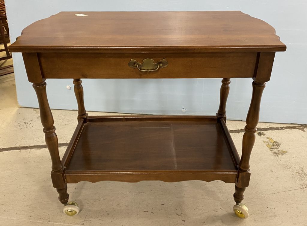 Cherry Rolling Serving Cart, single drawer, two tier, 29"h., 33"w., 23"d. Location Right Side 5th Row Cherry Rolling Serving Cart, single drawer, two tier, 29"h., 33"w., 23"d. Location Right Side 5th Row
