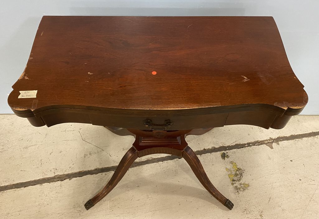 Vintage Mahogany Duncan Phyfe Game Table, pedestal base, has wear on finish, 30"h., 31"w. Location Right Side 2nd Row Vintage Mahogany Duncan Phyfe Game Table, pedestal base, has wear on finish, 30"h., 31"w. Location Right Side 2nd Row
