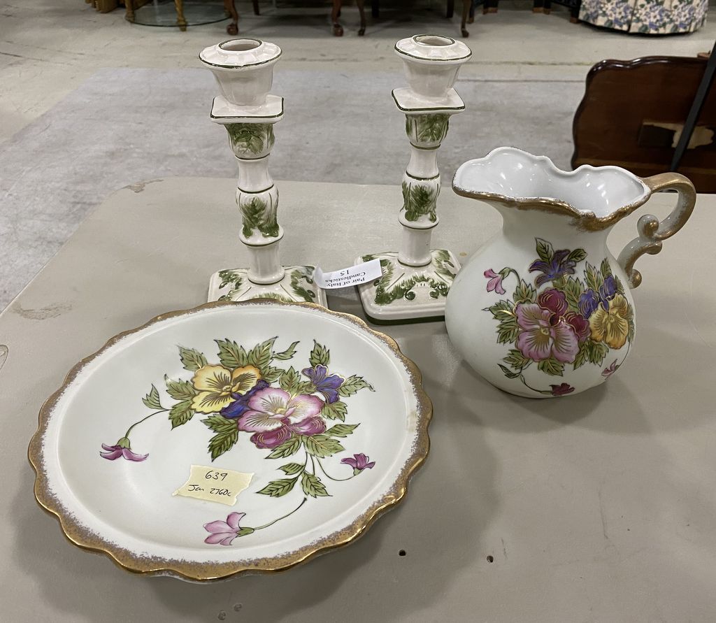 639 Pair of Candle Sticks, Pitcher and Bowl