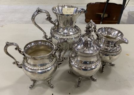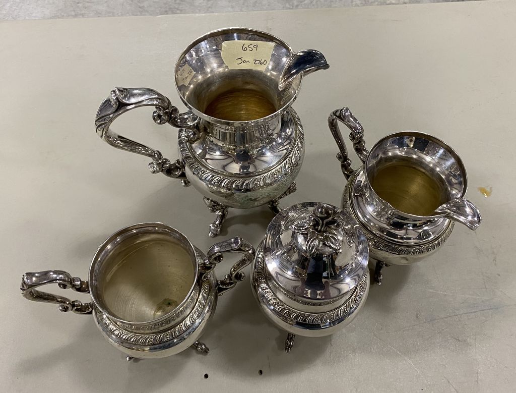 Windsor Plaque Silver Plate Serving Set, pitcher, creamer ( has dent), waste, sugar. Location Back Front Side Metal Shelves 2nd Shelf Windsor Plaque Silver Plate Serving Set, pitcher, creamer ( has dent), waste, sugar. Location Back Front Side Metal Shelves 2nd Shelf