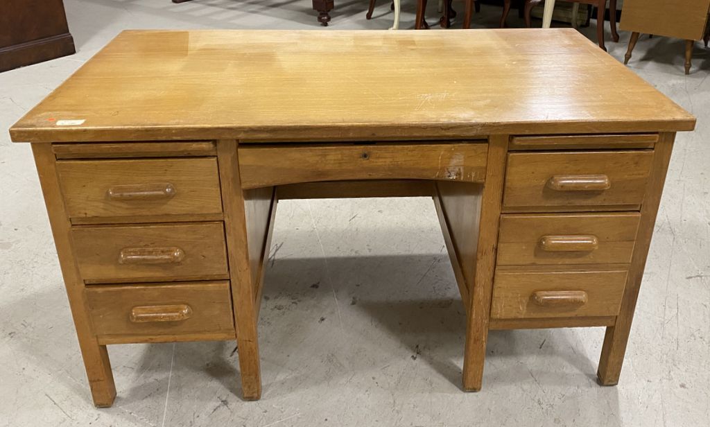 Vintage Oak Office Desk, has faded areas, 30"h., 54"w., 30"d. Location Left Side 2nd Row Vintage Oak Office Desk, has faded areas, 30"h., 54"w., 30"d. Location Left Side 2nd Row
