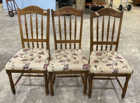 Set of 3 Spindle Back Chairs, fabric has light stains. Location Left Side 4th Row Set of 3 Spindle Back Chairs, fabric has light stains. Location Left Side 4th Row