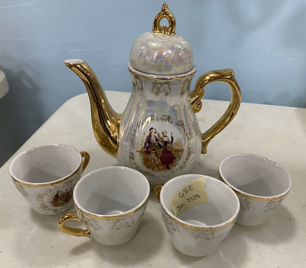Made In China Small Porcelain Tea Set, pitcher 7"h., four cups, gold gilt trim. Location Front Shelves 2nd Shelf Made In China Small Porcelain Tea Set, pitcher 7"h., four cups, gold gilt trim. Location Front Shelves 2nd Shelf
