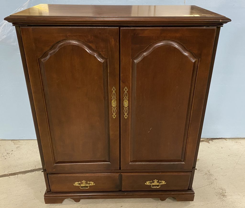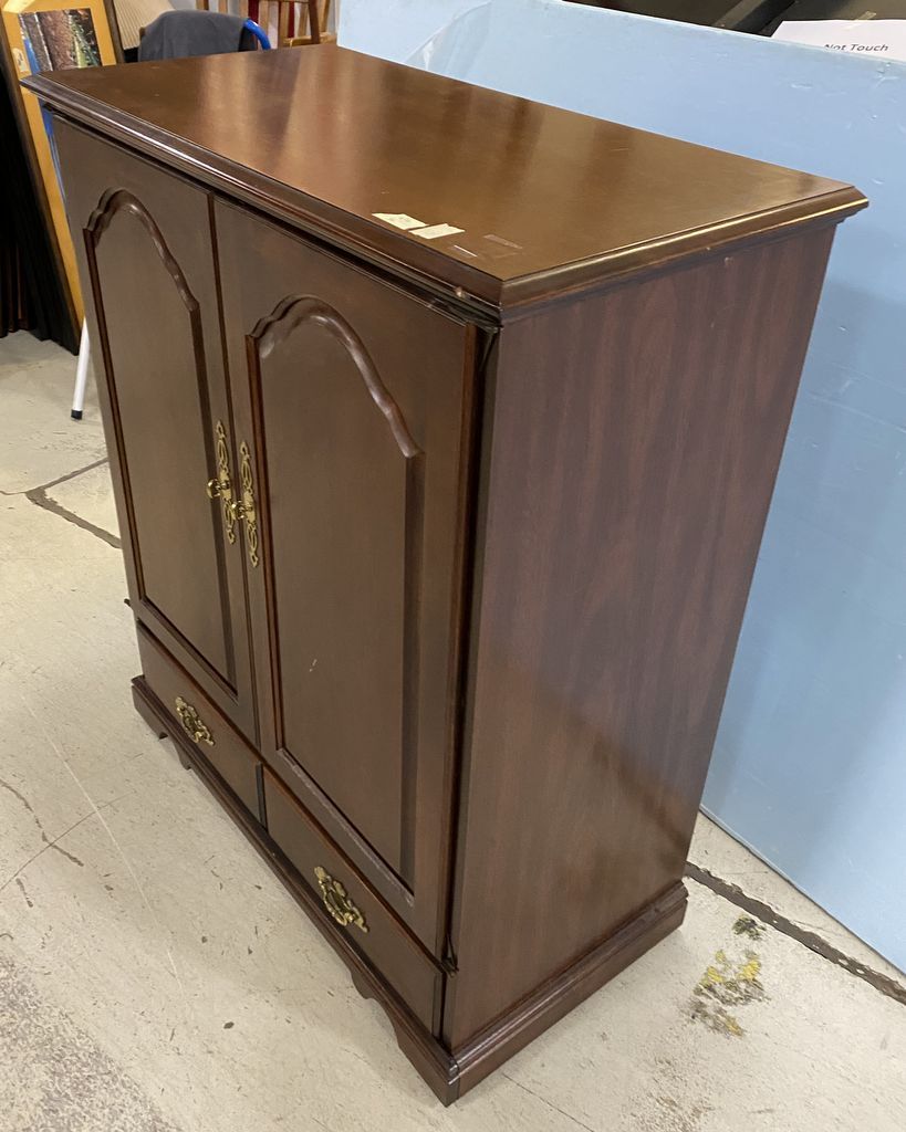 Two Door Cherry TV Cabinet, two door, on wheels, 45"h., 38"w., 19"d. Location Right Side 5th Row Two Door Cherry TV Cabinet, two door, on wheels, 45"h., 38"w., 19"d. Location Right Side 5th Row
