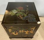 Drexel Chinoiserie Two Door Cabinet, black lacquer, two door, light wear, 20"h., 24"w. Location Right Side 5th Row Drexel Chinoiserie Two Door Cabinet, black lacquer, two door, light wear, 20"h., 24"w. Location Right Side 5th Row