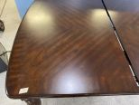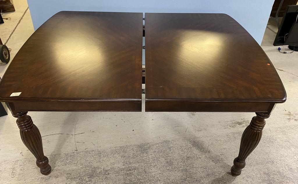 Modern Cherry Dining Table, faux banded style, one leaf, has finish pealing on feet, 30"h., 60"long, 40"w. Location Right Side 6th Row Modern Cherry Dining Table, faux banded style, one leaf, has finish pealing on feet, 30"h., 60"long, 40"w. Location Right Side 6th Row