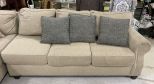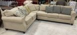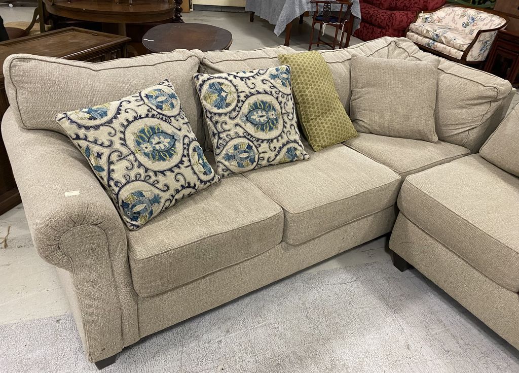 Two Piece Upholstered Sectional Sofa, Miskelly furniture, needs cleaning, included throw pillows. Location Left Side 3rd Row Two Piece Upholstered Sectional Sofa, Miskelly furniture, needs cleaning, included throw pillows. Location Left Side 3rd Row