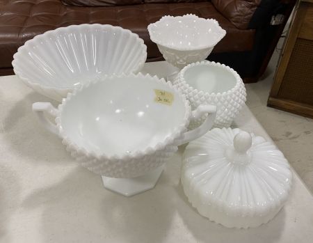 Five Pieces of Milk Glass, center piece, compotes, covered dish. Location Back Silver Metal shelves Five Pieces of Milk Glass, center piece, compotes, covered dish. Location Back Silver Metal shelves