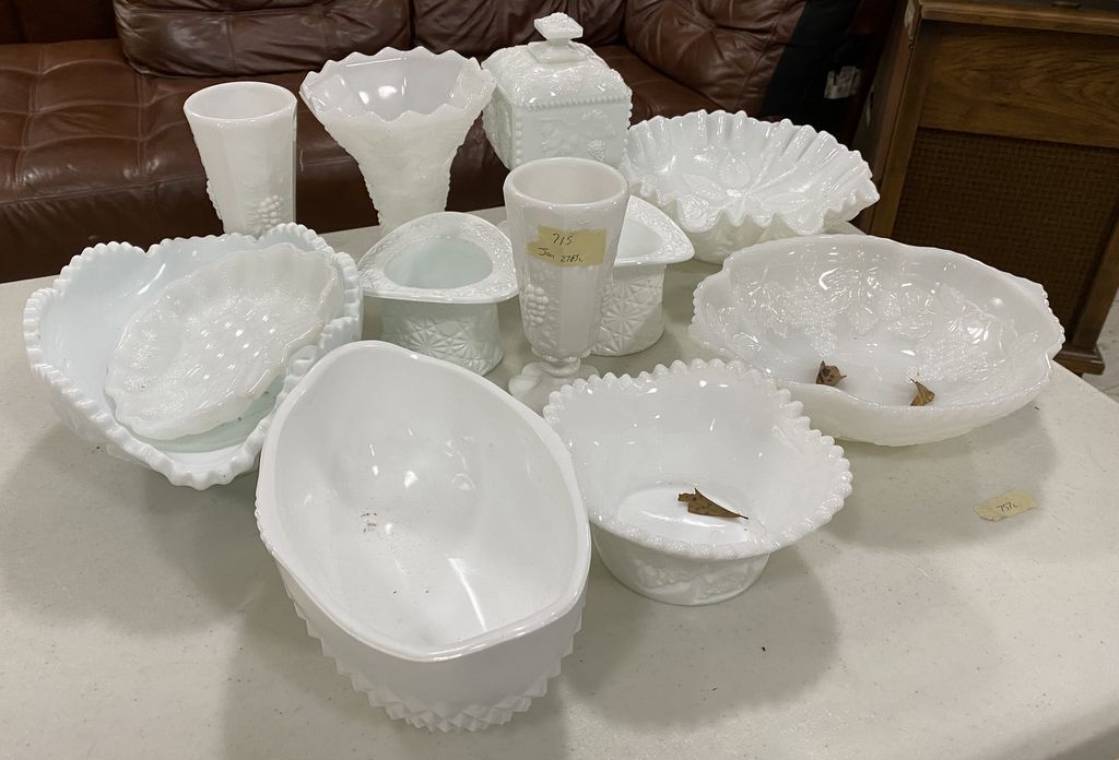 Group of Collectible Milk Glass, bowls, cups, candy dish, vases, hat vases. Group of Collectible Milk Glass, bowls, cups, candy dish, vases, hat vases.