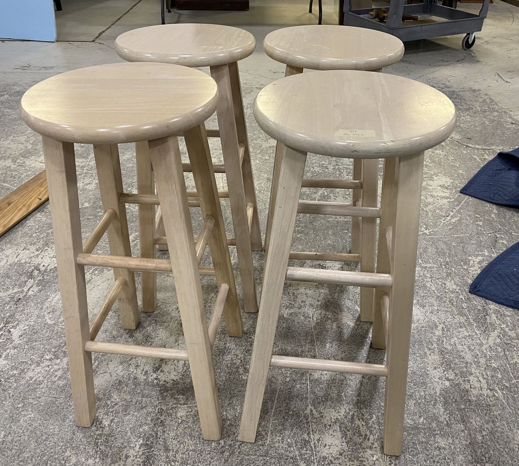 Four John Thomas Blonde Pine Bar Stools 29"h. Location Right Side 2nd Row Four John Thomas Blonde Pine Bar Stools 29"h. Location Right Side 2nd Row