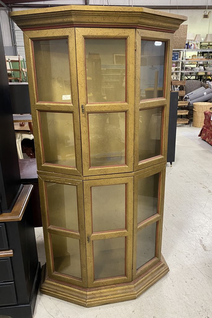 Gold Painted Curio Cabinet, lighted, bow front, some painted pealing, 71"h., 38"w. Location Left Side 2nd Row Gold Painted Curio Cabinet, lighted, bow front, some painted pealing, 71"h., 38"w. Location Left Side 2nd Row