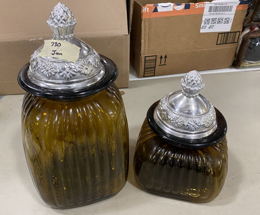 Two Green Glass Canisters, used, 13"h, Location: Back White Cases Two Green Glass Canisters, used, 13"h, Location: Back White Cases