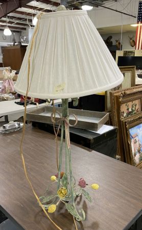 Green Metal Lamp with Flower Accents, with shade, 32"h. Location Back Front Side Metal Shelves Top Green Metal Lamp with Flower Accents, with shade, 32"h. Location Back Front Side Metal Shelves Top
