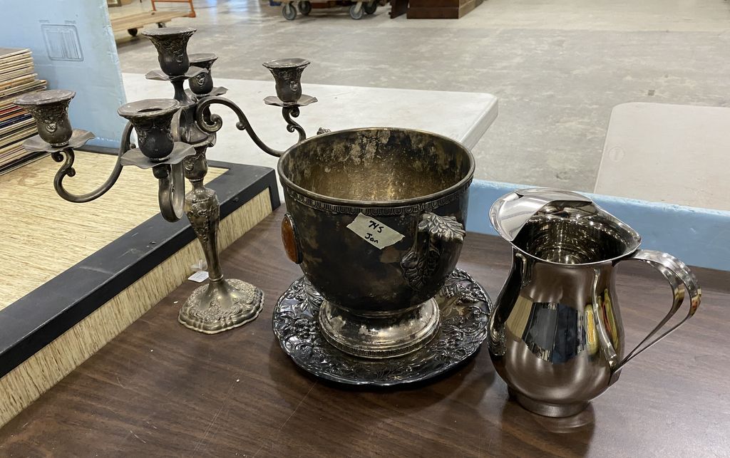 Silver Plate Candelabra, Ice Bucket, Plate, and Pitcher. Location Back Metal shelves Back Side 1st shelves Silver Plate Candelabra, Ice Bucket, Plate, and Pitcher. Location Back Metal shelves Back Side 1st shelves