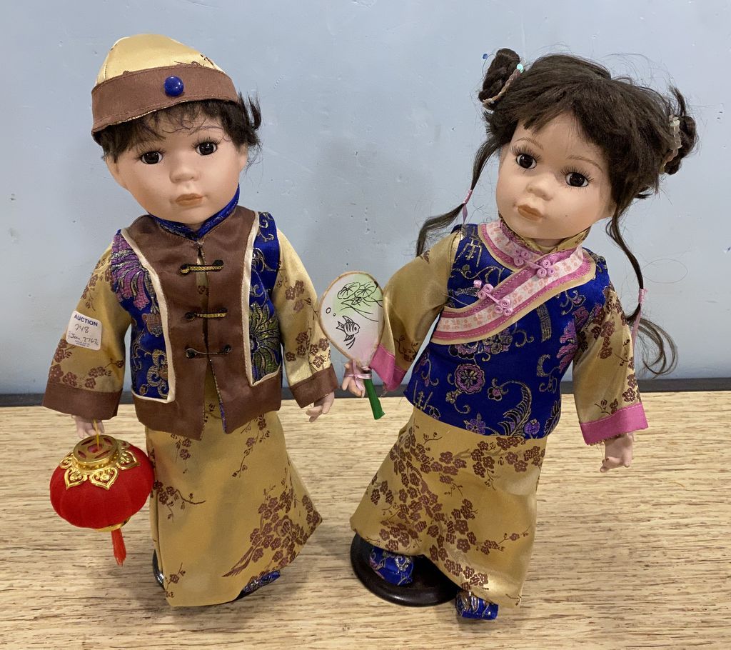 Two Porcelain Chinese Dolls, hand crafted clothing, on stand, 18"h. Location Cases by Screen Two Porcelain Chinese Dolls, hand crafted clothing, on stand, 18"h. Location Cases by Screen
