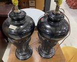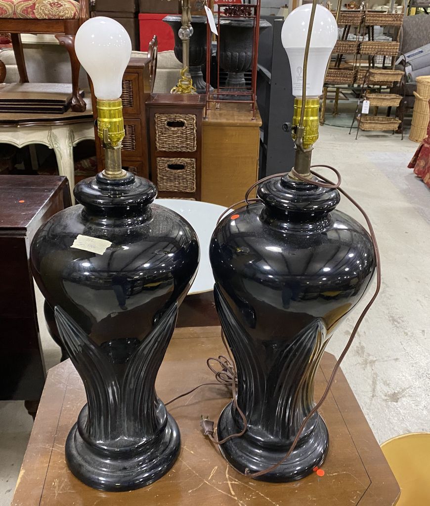 Art Nouveau Black Glass Vase lamps, with shades, 29"h. Art Nouveau Black Glass Vase lamps, with shades, 29"h.