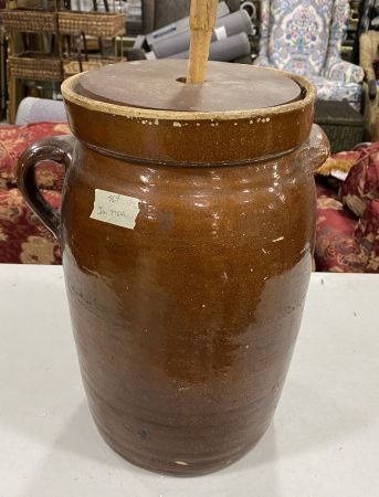 Stoneware Crock Butter Churn, has lid and wood churn, 16"h, Location Left Side 2nd Row Stoneware Crock Butter Churn, has lid and wood churn, 16"h, Location Left Side 2nd Row