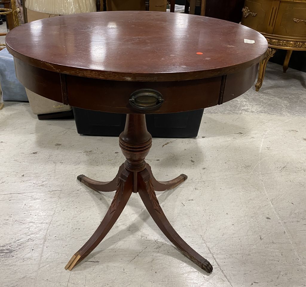 Duncan Phyfe Round Drum Table, one foot is damaged, has wear, 27"h., 26"w. Duncan Phyfe Round Drum Table, one foot is damaged, has wear, 27"h., 26"w.