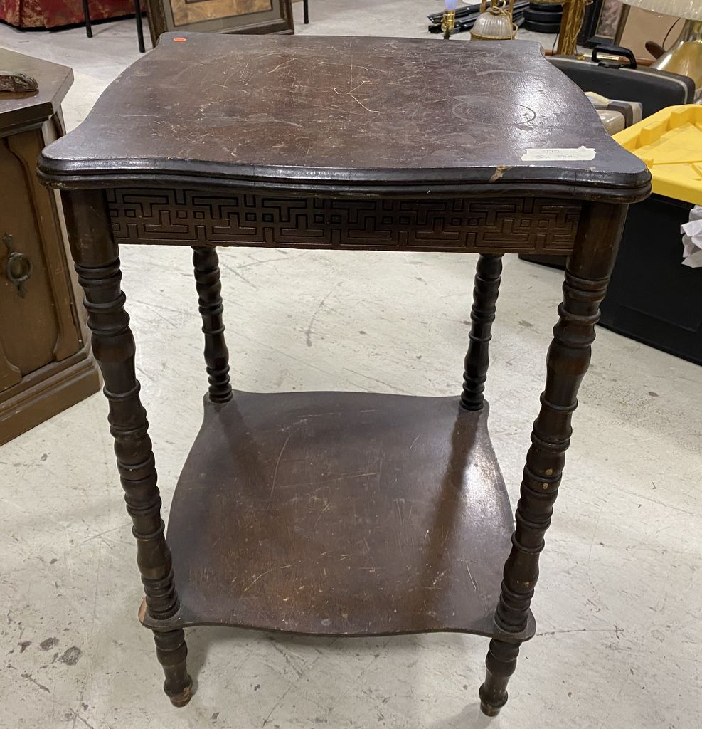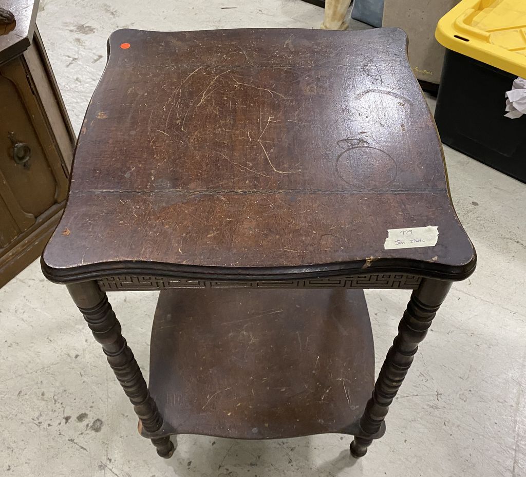 Mahogany Depression Era Side Table, two tier, has worn finish, 26"h., 17"w. Location Left Side 2nd Row Mahogany Depression Era Side Table, two tier, has worn finish, 26"h., 17"w. Location Left Side 2nd Row