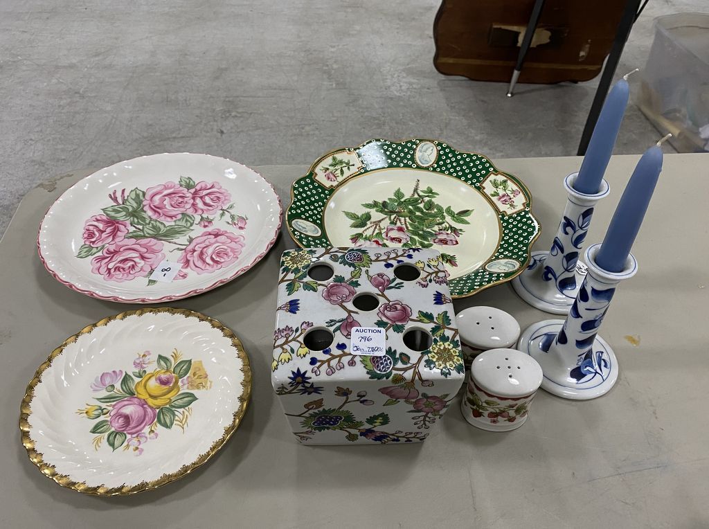 Group of Porcelain Decor, candle sticks, flower vase, salt & pepper, plates. Location Back Front Side Metal Shelves 2nd Shelf Group of Porcelain Decor, candle sticks, flower vase, salt & pepper, plates. Location Back Front Side Metal Shelves 2nd Shelf