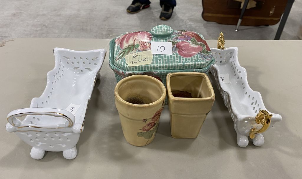 Ceramic Covered Pot, Two Mini Planters, Two Porcelain Dishes, Location Back Front Side Metal Shelves 2nd Shelf Ceramic Covered Pot, Two Mini Planters, Two Porcelain Dishes, Location Back Front Side Metal Shelves 2nd Shelf