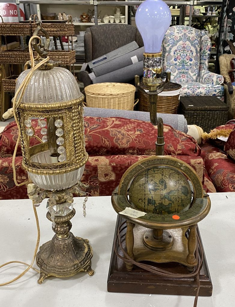 Globe Lamp and Art Deco Lamp, missing some prisms. Location Left Side 5th Row Globe Lamp and Art Deco Lamp, missing some prisms. Location Left Side 5th Row