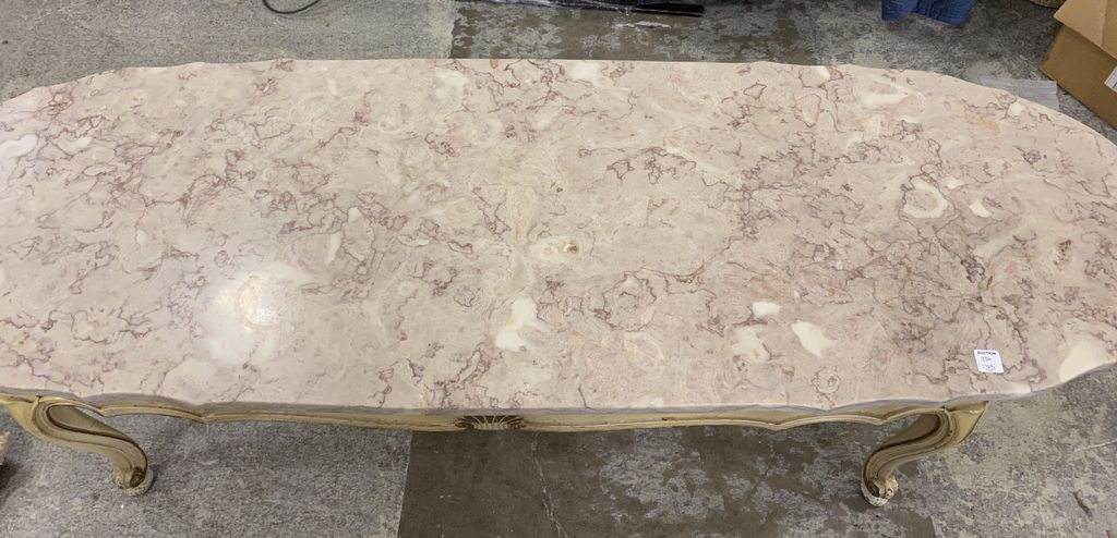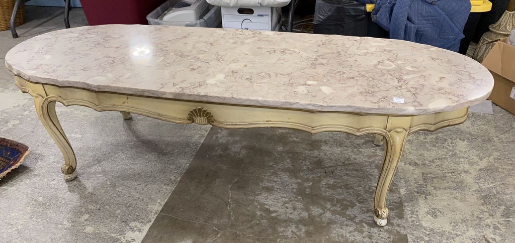 French Provincial Style Marble Top Coffee, painted base, 17"h., 60"w. Location Front French Provincial Style Marble Top Coffee, painted base, 17"h., 60"w. Location Front