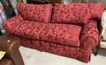 Paul Robert Red Upholstered Sofa, two cushions, good condition, 7'h. Location Left Side 5th Row Paul Robert Red Upholstered Sofa, two cushions, good condition, 7'h. Location Left Side 5th Row