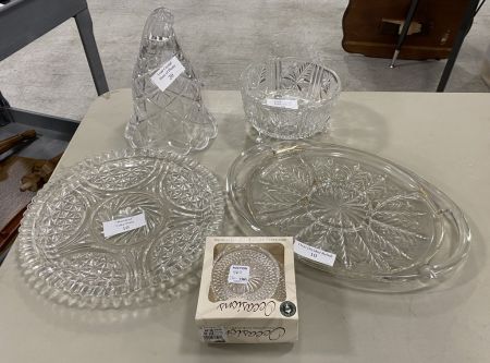 Lead Crystal Horn of Plenty, Lead Crystal footed bow, Oval Divided Relish, "Wexford" Cake Plate, Glass coasters. Location Back Front Side Metal Shelves 1st Shelf Lead Crystal Horn of Plenty, Lead Crystal footed bow, Oval Divided Relish, "Wexford" Cake Plate, Glass coasters. Location Back Front Side Metal Shelves 1st Shelf