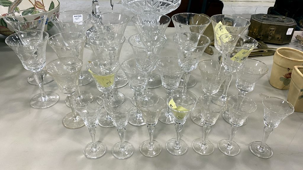 25 Crystal Stemware, etched design. Location Back Front Side Metal Shelves 1st Shelf 25 Crystal Stemware, etched design. Location Back Front Side Metal Shelves 1st Shelf