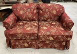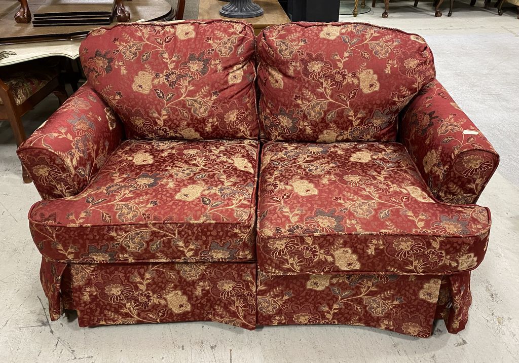 Floral Design Red Upholstery Love Seat , 5' long. Location Back of Center Floral Design Red Upholstery Love Seat , 5' long. Location Back of Center