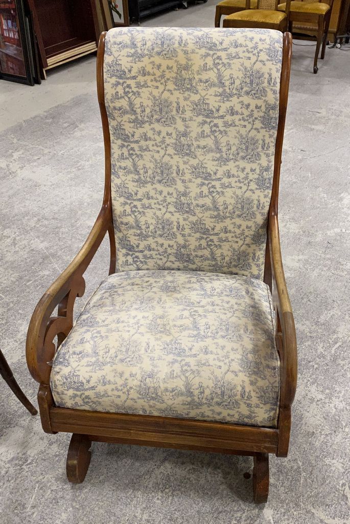 Victorian Style Platform Rocker, fabric is dirty. Location Front Victorian Style Platform Rocker, fabric is dirty. Location Front
