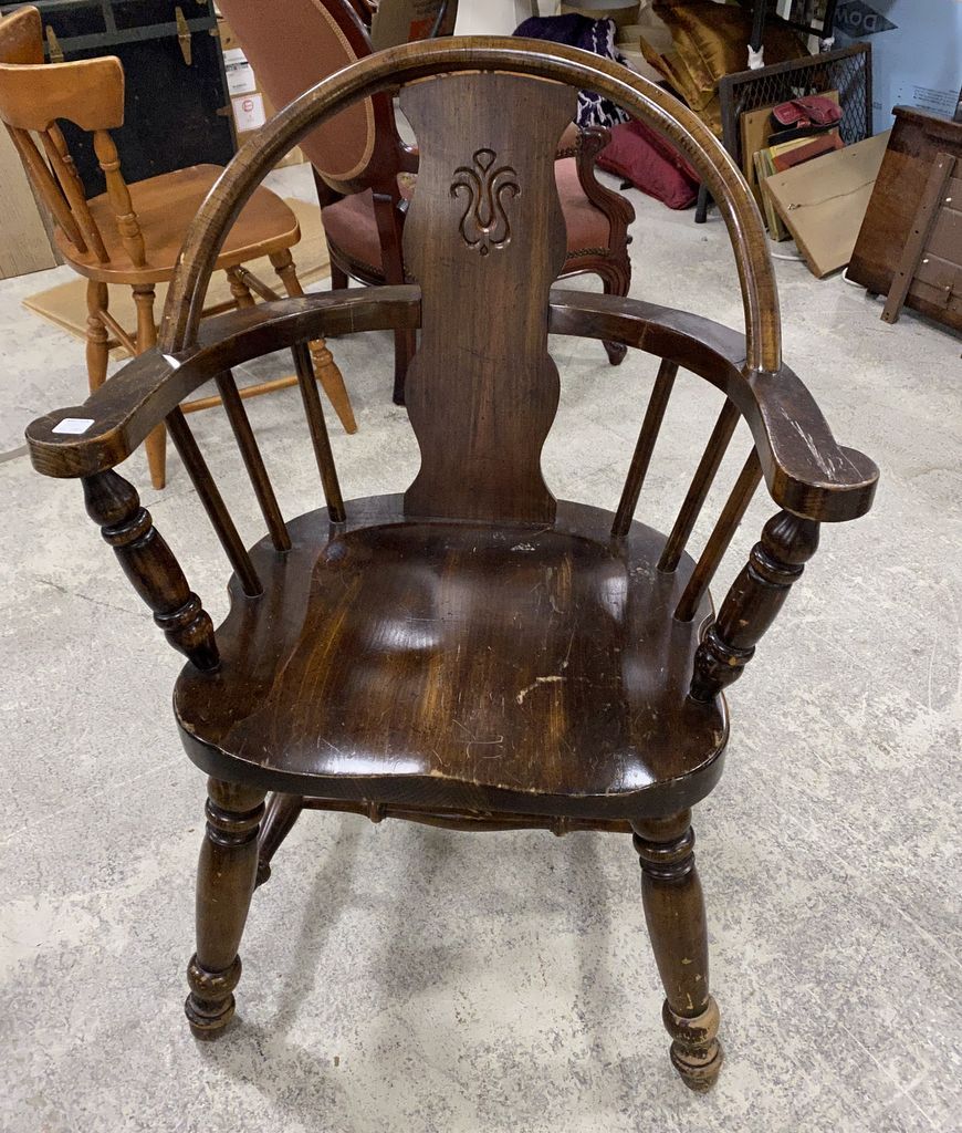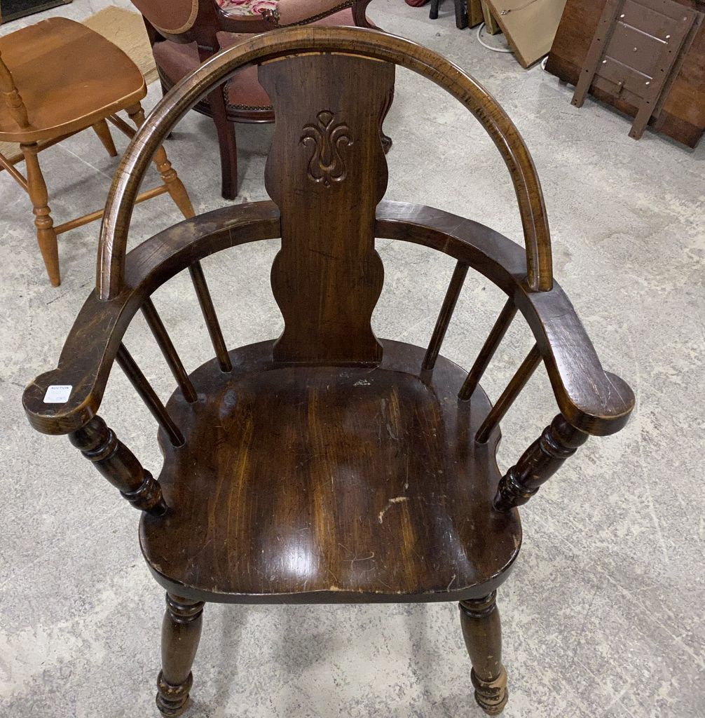 Pine Primitive Style Windsor Chair, has scratches on finish. Location Front Pine Primitive Style Windsor Chair, has scratches on finish. Location Front