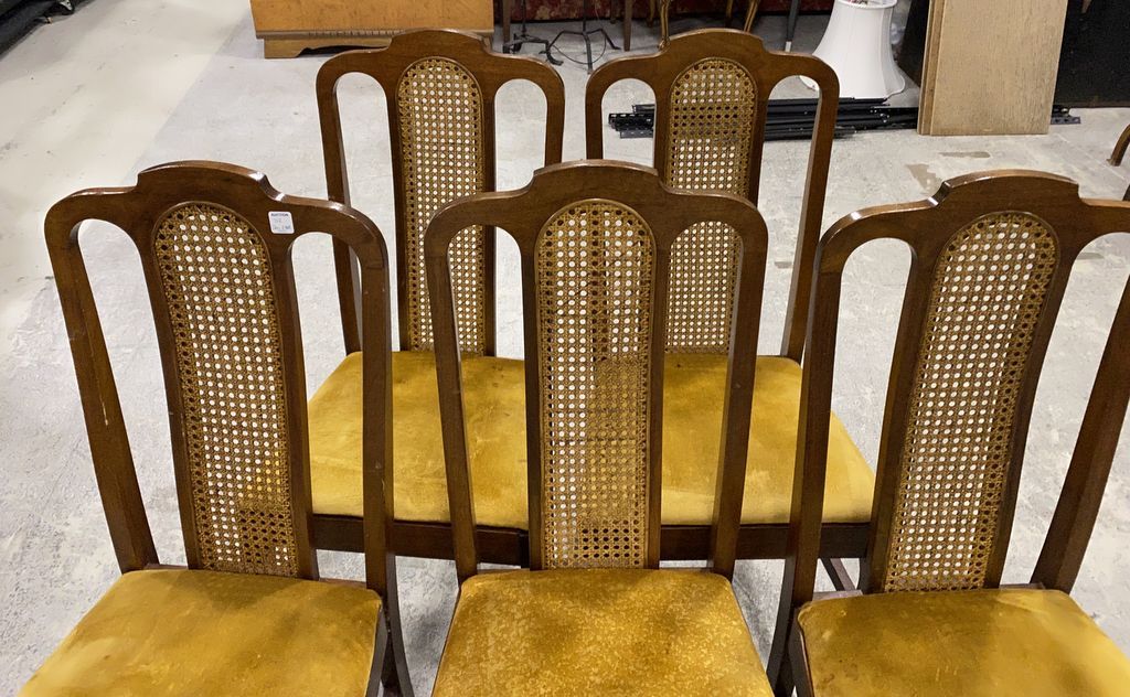 Five Queen Anne Caned Back Dining Chairs, light wear. Location Front Five Queen Anne Caned Back Dining Chairs, light wear. Location Front