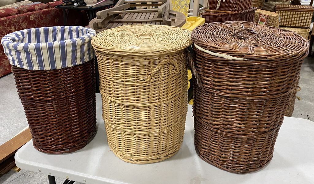 Three Woven Baskets, one with quilts, 18"h. Three Woven Baskets, one with quilts, 18"h.