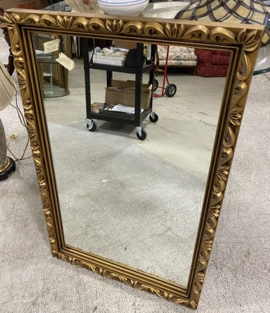 Gold Plastic Framed Mirror, 35"h., 23"w. Location Back Wall Gold Plastic Framed Mirror, 35"h., 23"w. Location Back Wall